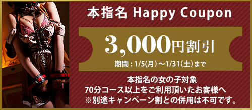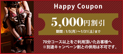 ※70分以上のコースが対象となります。※本指名の方は適応外。 ※ご利用期間は1/5(月)~1/31(土)迄となります。 ※別途キャンペーン割との併用は不可です。 ※...